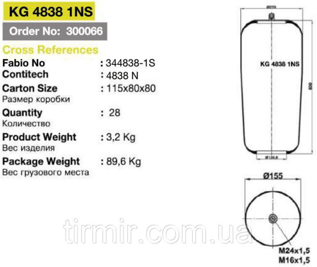 Пневморессора подвески без стакана 4838N Производитель: KRAFTIGER; Страна производитель: Турция
